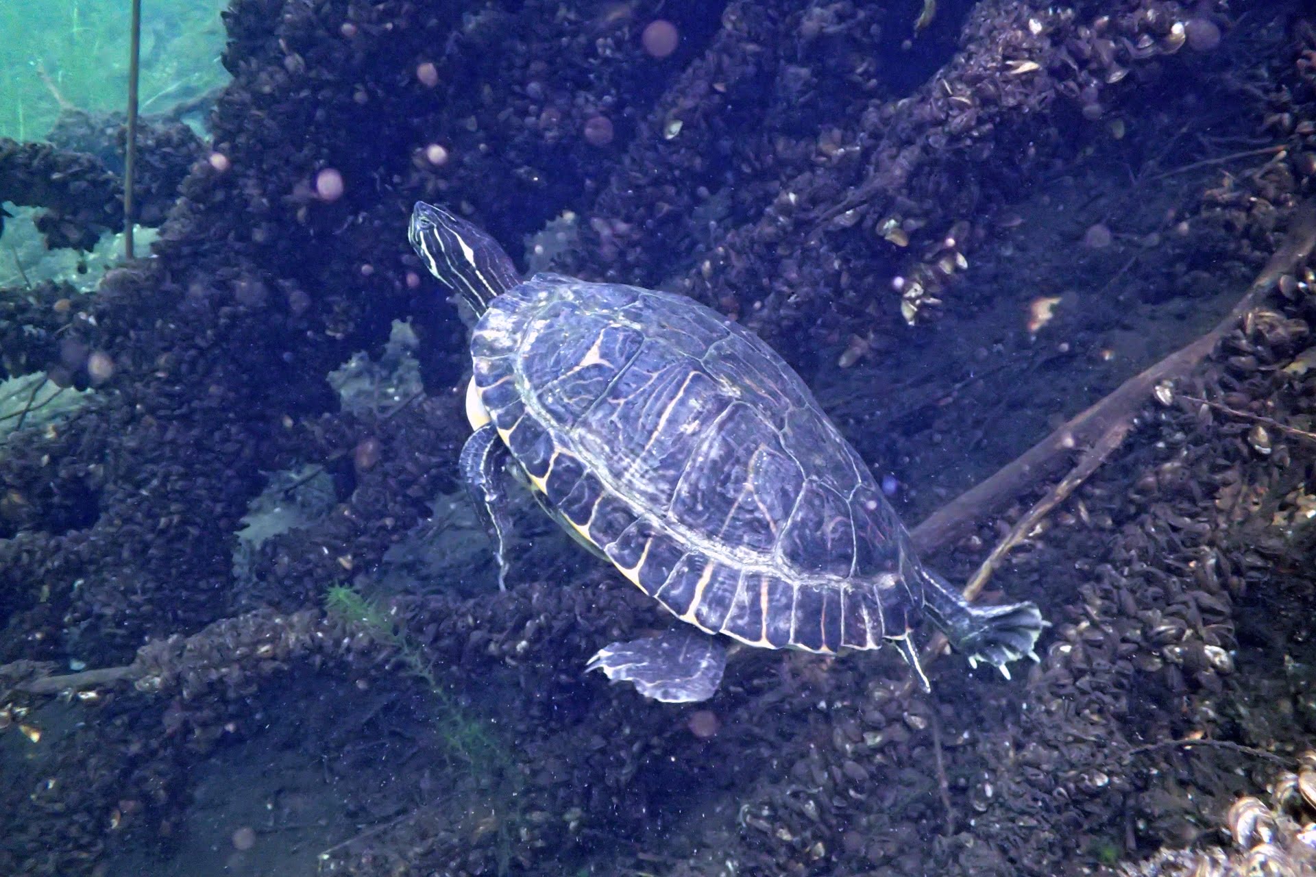Een geweldige snoek (Esox lucius) (speciaal voor Willem Latijnse namen) van ruim 1 meter, een geelbuikschildpad (Trachemys scripta scripta) in de prachtige begroeide onderwater bomen, grote diepslak (Bithynia tentaculata) waren slecht enkele van de prachtige soorten die wij in kraakhelder water van 15 graden tegenkwamen.